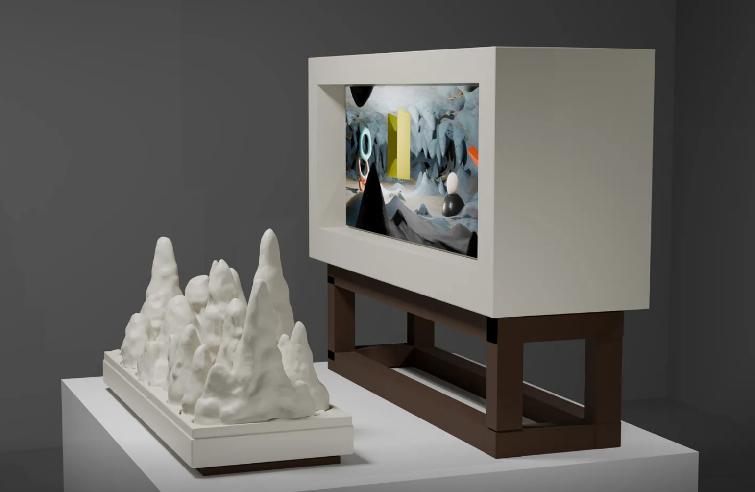 A floating cube drifts downward, strikes the ground, and splits open, revealing a small sphere that begins to bounce from its hollow core.